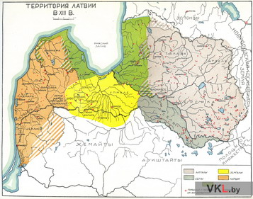 Карта Лівоніі ў 13 ст. з пазначэннем плямёнаў. З кнігі: История Латвийской ССР. Том I. С древнейших времен до 1860 года. Рига: Издательство Академии наук Латвийской ССР, 1952. Вклейка между с. 84—85 (аўтарства не пазначана).