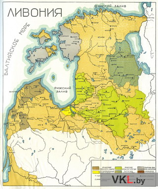 Карта Лівоніі ў 14—15 ст. з пазначэннем межаў дзяржаўных утварэнняў. З кнігі: История Латвийской ССР. Том I. С древнейших времен до 1860 года. Рига: Издательство Академии наук Латвийской ССР, 1952. Вклейка между с. 112—113 (аўтарства не пазначана).