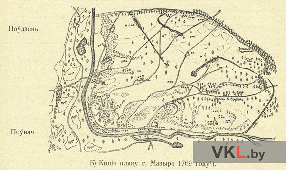 План Мазыра 1769 г. (копія). З працы: Крукоўскі A.Я. Горад Мазыр і яго ваколіцы // Наш край. Штомесячнік Цэнтральнага Бюро Краязнаўства пры Інстытуце Беларускае Культуры. 1927. № 3 (18). С. 24.