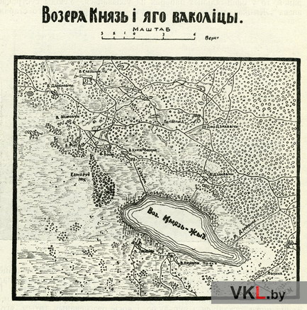 Карта возера Князь (Жыд). З працы: Мікіцінскі, Р.Пяцэвіч і П.Ажэўскі. Падарож па Случчыне // Наш край. Штомесячнік Цэнтральнага Бюро Краязнаўства пры Інстытуце Беларускае Культуры. 1928. № 3 (30). С. 30.