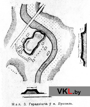 План часткі Лукомля. З працы: Каваленя А.Зьм. Археолёгічныя росшукі ў вярхоўях рэк Друці, Усяж-Бук і Лукомкі // Працы сэкцыі археолёгіі. Том ІІІ. Менск, 1932. (Беларуская Акадэмія Навук. Інстытут гісторыі). С. 189.