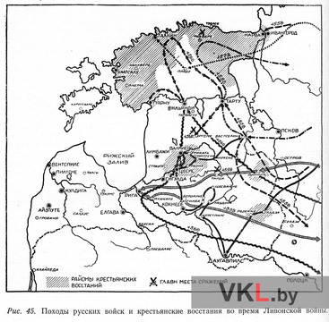 Карта ваенных дзеянняў і сялянскіх паўстанняў у Лівоніі ў час Лівонскай вайны 1558—1582 г. З кнігі: История Латвийской ССР. Том I. С древнейших времен до 1860 года. Рига: Издательство Академии наук Латвийской ССР, 1952. С. 166 (аўтарства не пазначана).