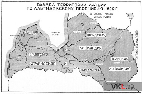 Карта дзяржаўных і адміністрацыйных утварэнняў у Лівоніі згодна з Альтмаркскім перамір’ем 1629 г. З кнігі: История Латвийской ССР. Том I. С древнейших времен до 1860 года. Рига: Издательство Академии наук Латвийской ССР, 1952. С. 193 (аўтарства не пазначана).