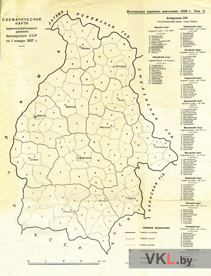 Карта БССР. Адміністрацыйны падзел на 1 студзеня 1927 г. З кнігі: Всесоюзная перепись населения 1926 года. Том Х. Белорусская Советская Социалистическая Республика. Народность. Родной язык. Возраст. Грамотность. М.: Издание ЦСУ Союза ССР, 1928.