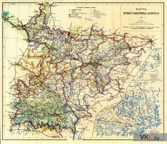 Карта Верхняга Падняпроўя і Беларусі. З кнігі: Россия. Полное географическое описание нашего отечества. Настольная и дорожная книга для русских людей / Под редакцией В.П.Семенова и род общим руководством П.П.Семенова и В.И.Ламанского. Том девятый. Верхнее Поднепровье и Белоруссия / Составили: В.П.Семенов, М.В.Довнар-Запольский, Д.З.Шендрик, А.К.Кабанов, А.П.Сапунов. СПб.: Издание А.Ф.Девриена, 1905.