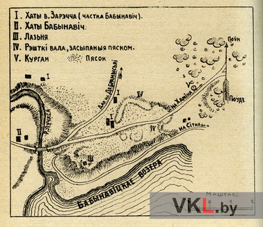 План часткі Бабінавічаў 1926 г. З працы: Сяргеенка Я. Гарадзішча пры паселішчы Бабынавічы // Наш край. Штомесячнік Цэнтральнага Бюро Краязнаўства пры Інстытуце Беларускае Культуры. 1926. № 8—9 (11—12). С. 56.