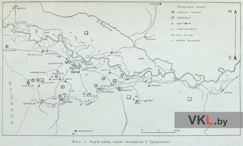 План Турава і ваколіц. З працы: Каваленя А.Зьм., Шутаў С.С. Матар’ялы з дагісторыі Тураўшчыны // Беларуская Акадэмія Навук. Запіскі аддзелу гуманітарных навук. Кніга 11. Працы археолёгічнай камісіі. Том ІІ. Менск, 1930. С. 340.