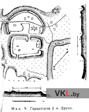 План часткі Друцка. З працы: Каваленя А.Зьм. Археолёгічныя росшукі ў вярхоўях рэк Друці, Усяж-Бук і Лукомкі // Працы сэкцыі археолёгіі. Том ІІІ. Менск, 1932. (Беларуская Акадэмія Навук. Інстытут гісторыі). С. 191.