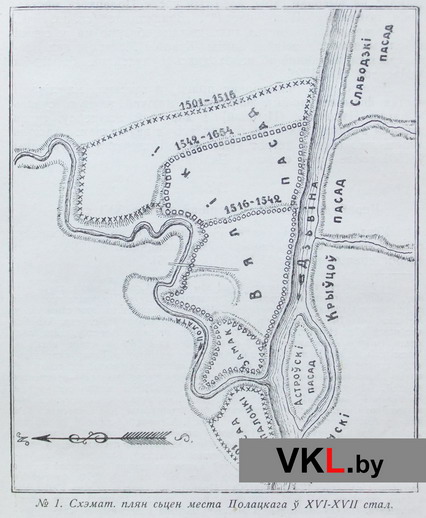 План умацаванняў Полацка 16—17 ст. З працы: Даўгяла Зьмітра. Polociae moenia. (Гістарычна-топографічны нарыс Полацкіх умацаваньняў) // Працы клясы гісторыі. Том ІІ. Менск, 1928. (Інстытут беларускае культуры. Запіскі аддзелу гуманітарных навук. Кніга 3). С. 217.