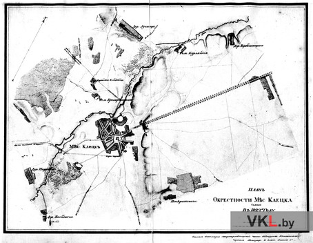 План Клецка і ваколіц. 1822 г. Гэта выява — чорна-белы здымак з арыгінала. ЦГВИА СССР. Ф. ВУА. Спр. 19670. Арк. 2.